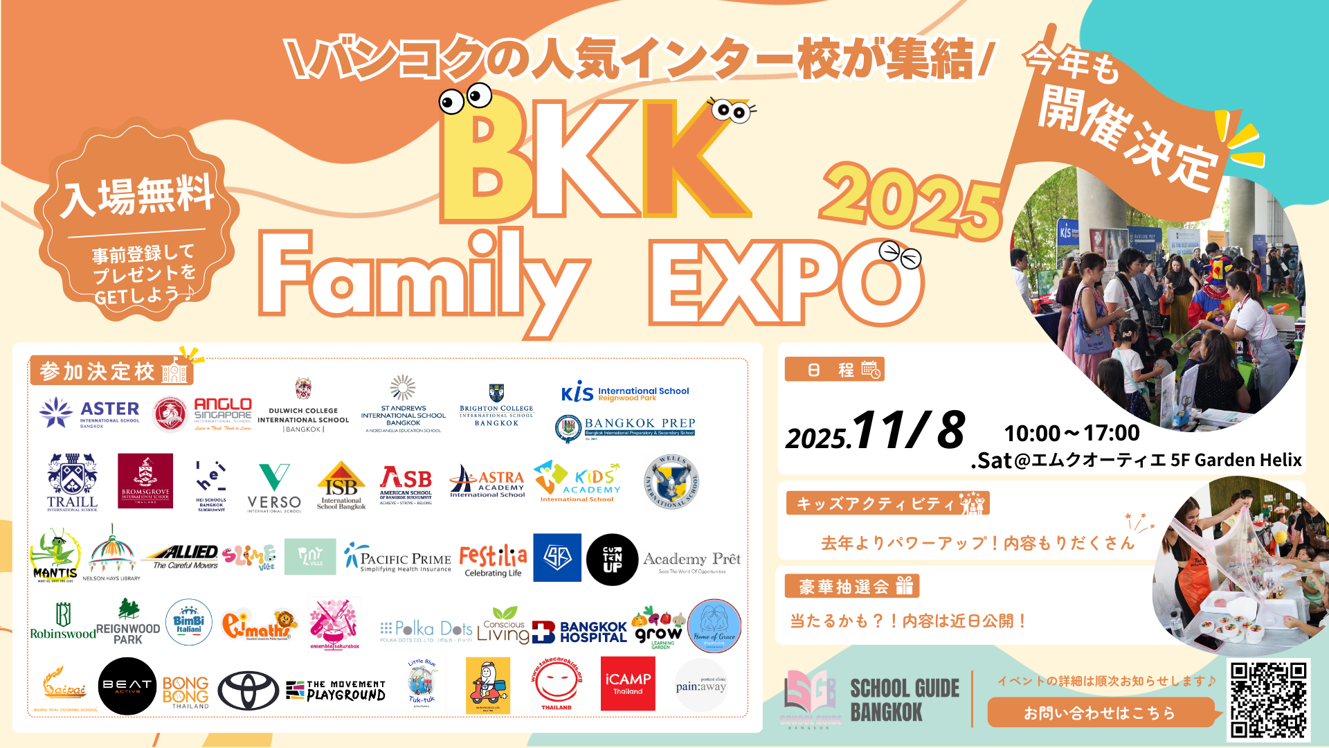 2025年11月8日(土曜日)にプロンポン駅に直結した高級ショッピングモール、エムクオーティの5階にてインター校を集めたファミリーイベント・BKK Family Expo 2025を開催致します!赤ちゃん〜高校生まで、ご家族で参加して楽しめるイベントです。お子様それぞれに合わせたブースをご用意予定です。