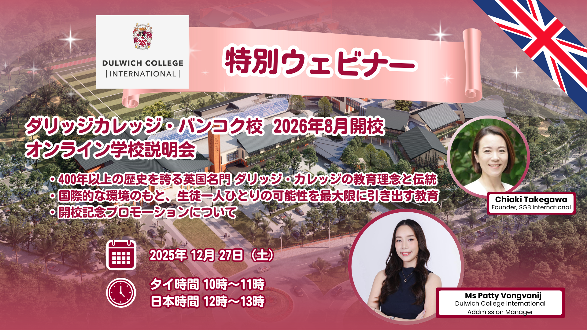 2026年8月に開校するダリッジカレッジ・バンコク校の無料オンライン説明会を開催致します。 長年にわたり高い学力レベルを誇り、多くの卒業生がオックスフォード大学やケンブリッジ大学、世界の名門大学に進学しており、現在では中国、韓国、シンガポール、そしてタイ・バンコクに2026年に開校。イギリス本校の伝統を受け継ぎつつ、国際的な環境に合わせた教育を行っております。