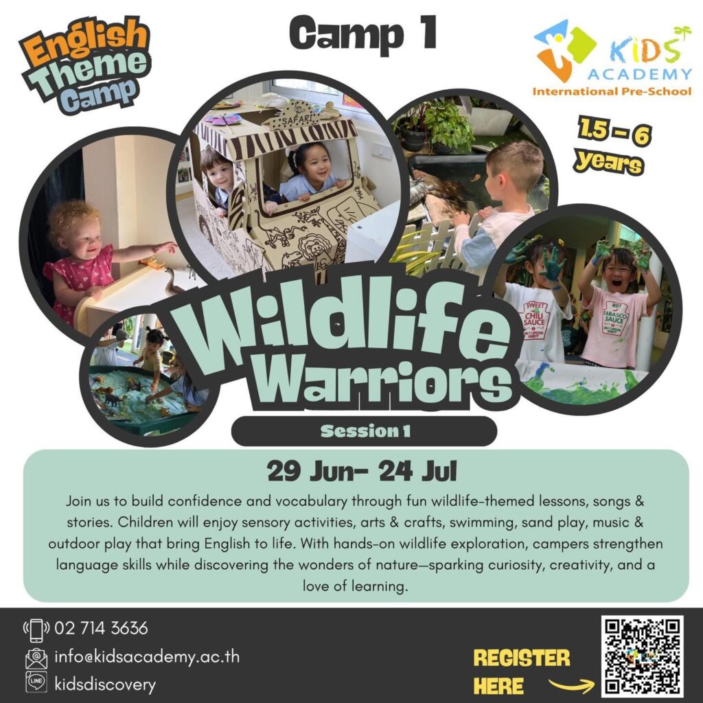 | Wildlife warriors camp | 2026年6月29日~7月3日 2026年7月6日~10日 2026年7月13日~17日 2026年7月20日~24日 | 1.5歳〜年長 | 8時半〜2時 | 4週間 41,790バーツ (約204,771円) 1週間 10,480バーツ (約51,352円) |